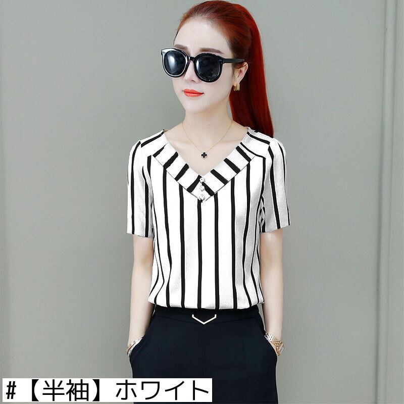ストライプ半袖シャツ女性2021年新夏ルーズファッション春秋服オールマッチ薄手のウエスタンスタイルシャツ スプリング 春物 サマー 夏物 オータム 秋物 suifa46782594058 | shop CFT