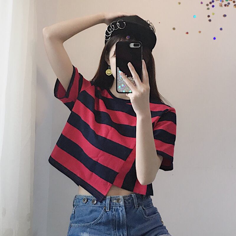 2021年夏のラウンドネックルーズストライプTシャツレディース半袖原宿スタイルショートイレギュラートップボトミングシャツ かわいい サマー 夏物 Oネック suifa10375896965 | shop CFT
