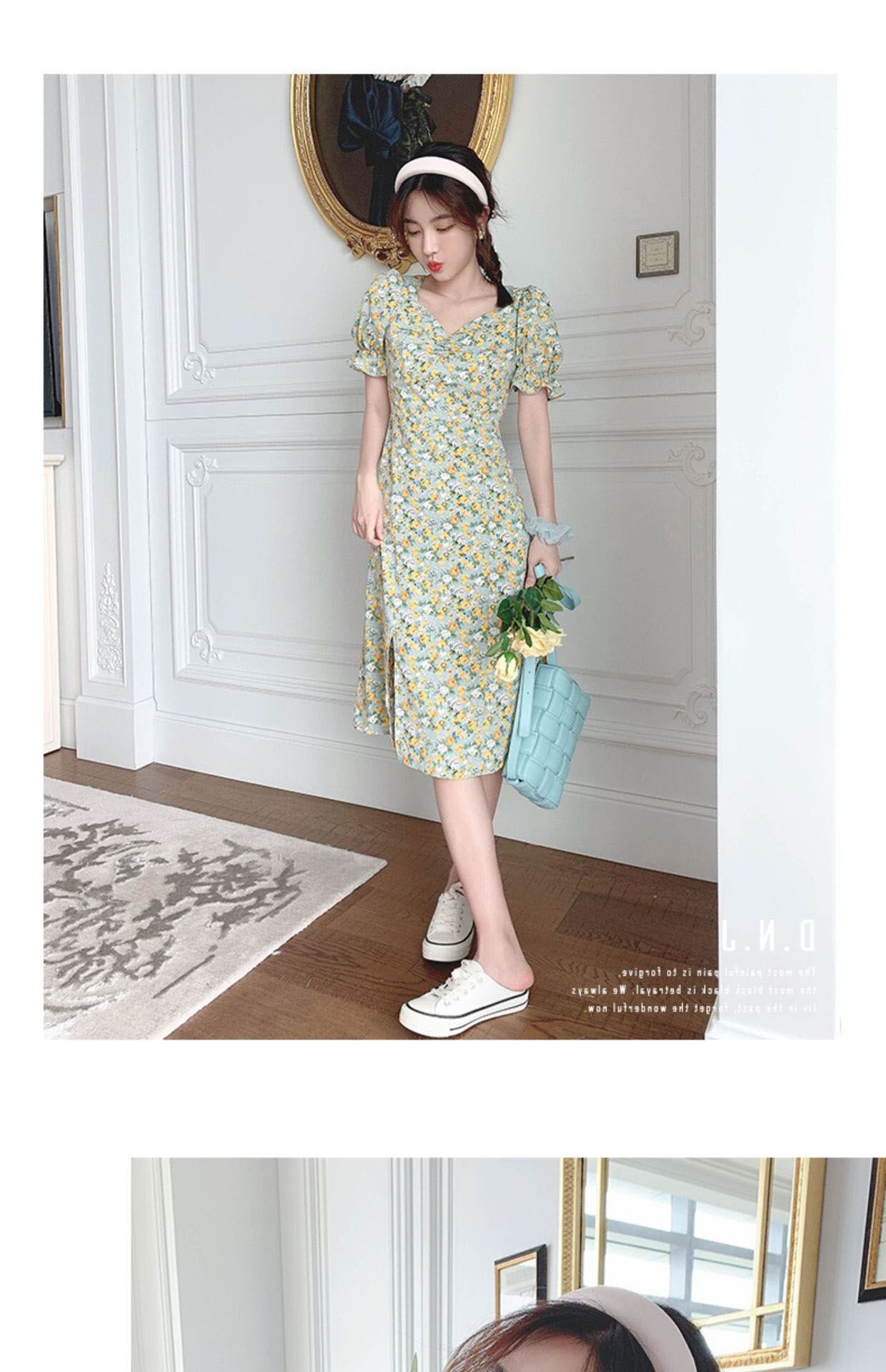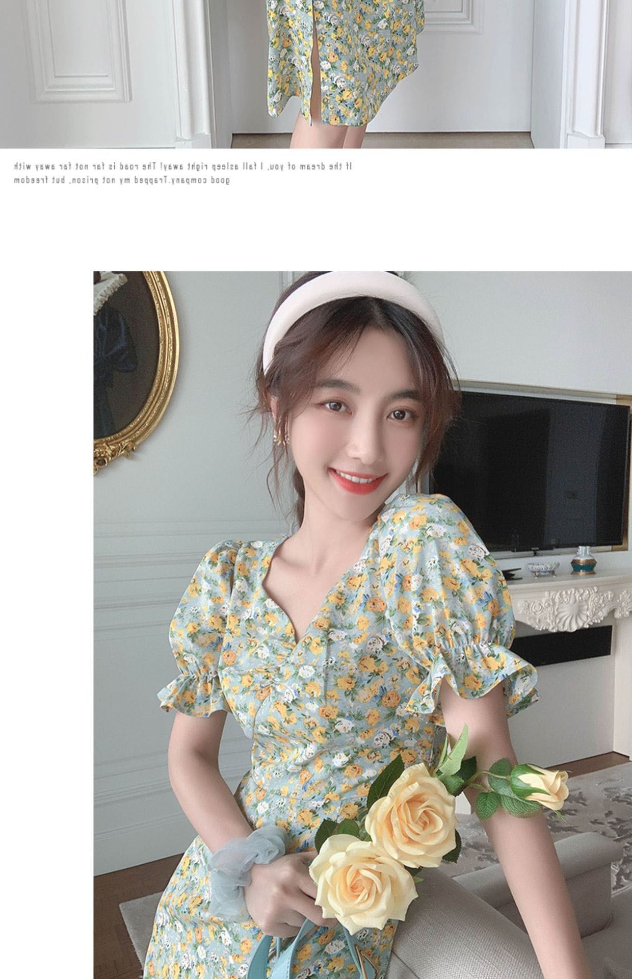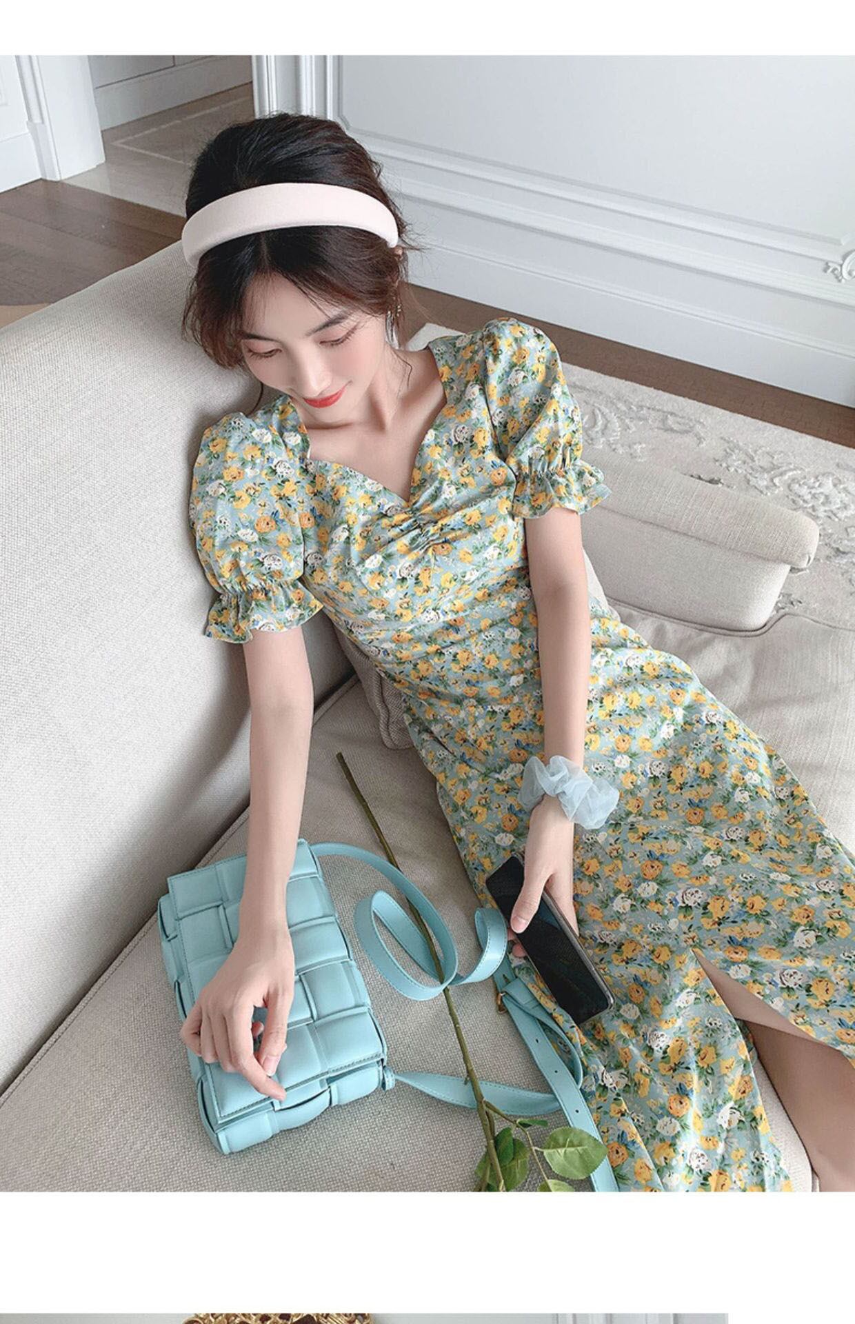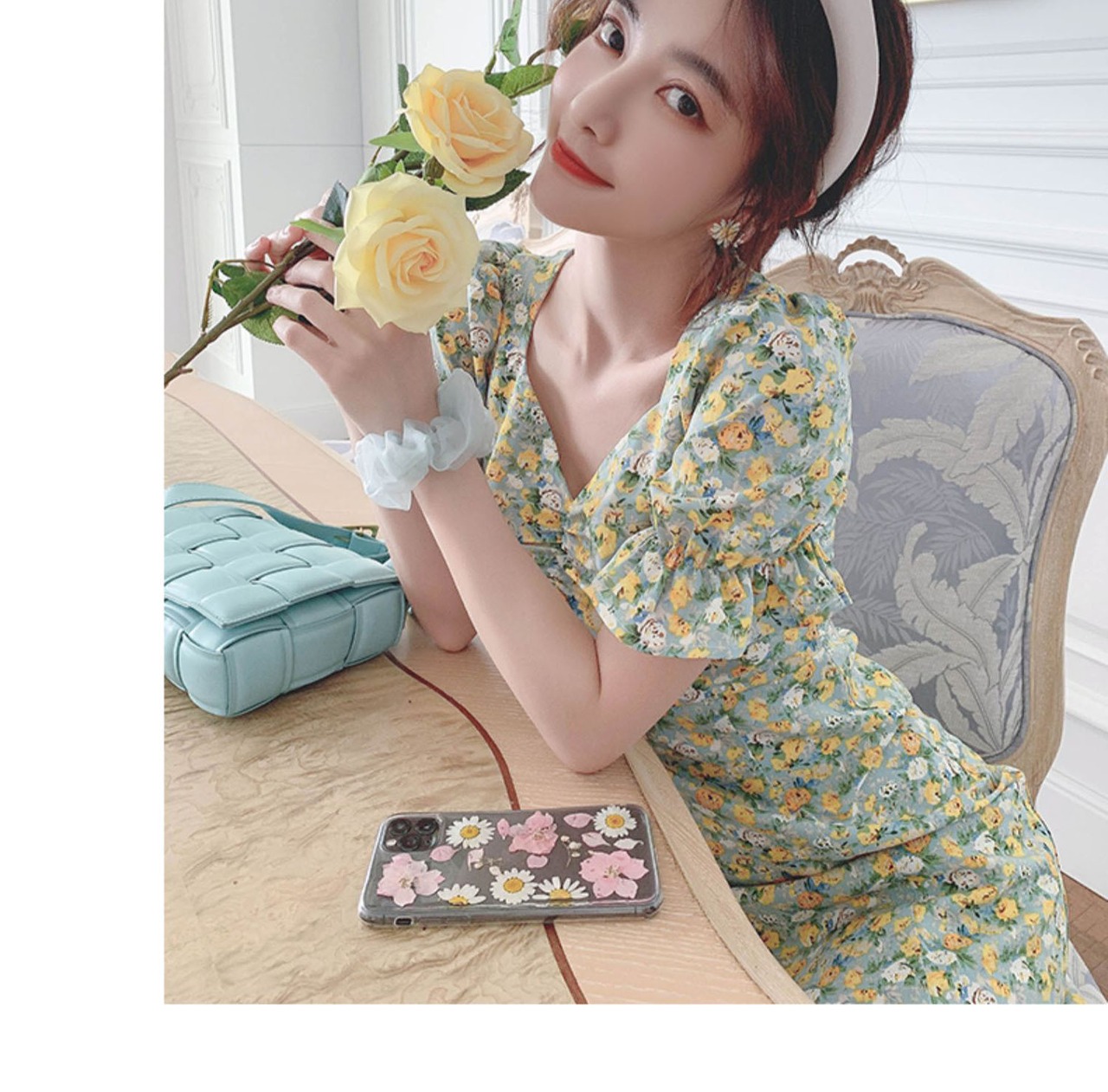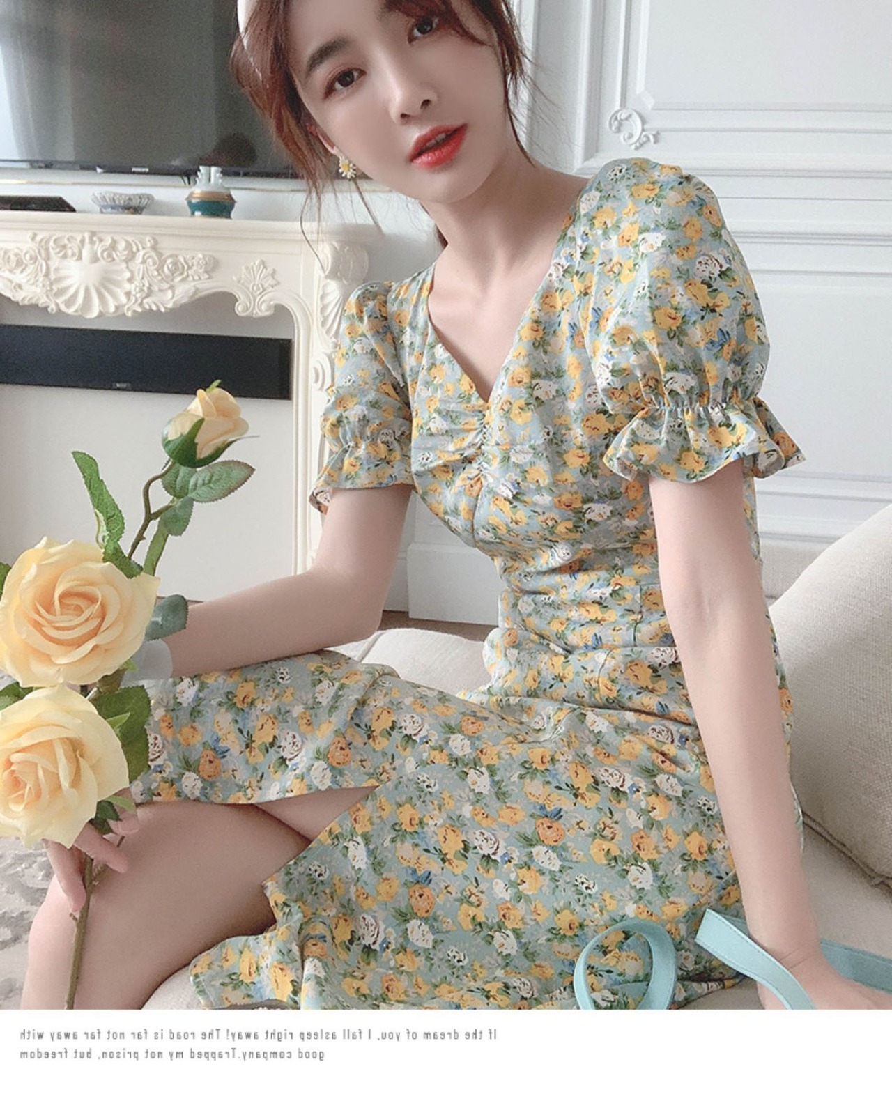 2021年新作フローラルドレスレディーススモールスカートサマードレスフレッシュでスウィートなパフスリーブVネックミドル丈 大人ガーリー キュート カジュアル 夏物 花柄 suifa46134439301 | shop CFT