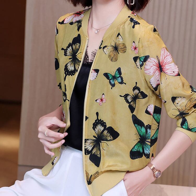 シフォンプリントショートジャケットレディース2021年春秋サンプロテクションシャツジッパーベースボールユニムシンカーディガントップス スプリング 春物 オータム 秋物 suifa92692719964 | shop CFT