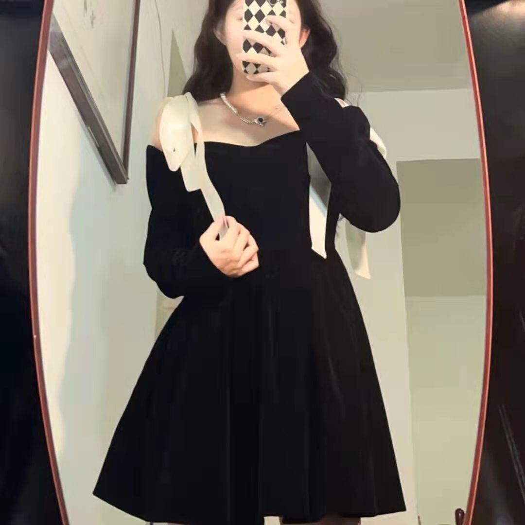 ゴールドベルベットフレンチドレス2022新しいヘップバーンスタイルの弓秋冬長袖リトルブラックドレス女性insAラインスカート ロング リボン オータム 秋物 ウィンター 冬物 suifa72032506522 | shop CFT