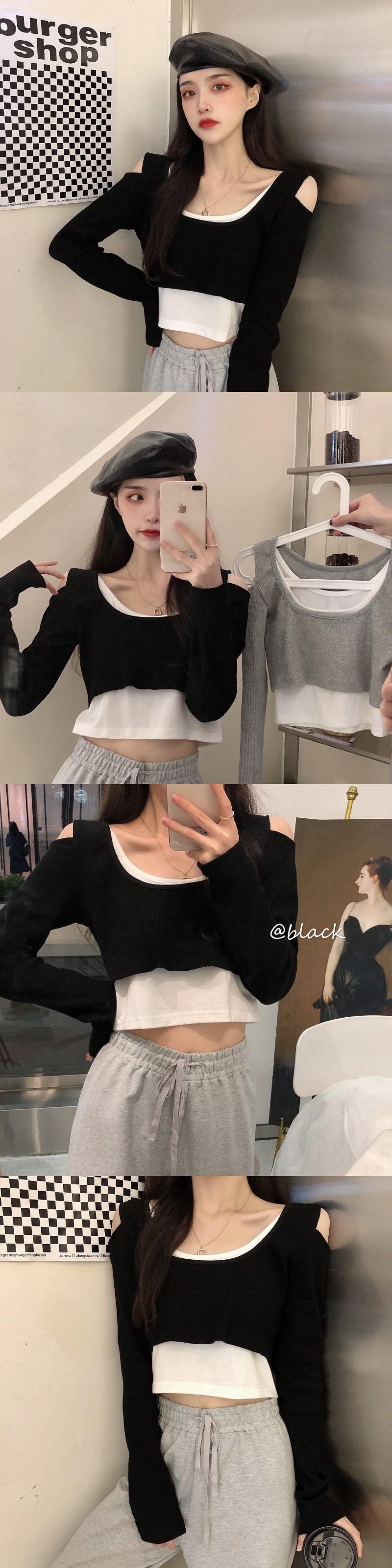 香港スタイルの純粋な欲望スタイルスリムでスリムなデザインセクシーなフェイクツーピースヨーロピアンショートオフショルダー長袖トップ女性 ロング ピュア suifa12674220049 | shop CFT