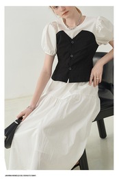 ブリティッシュスタイルの気質ドレスレディースクロスボーダー新デザインセンスコントラストカラーフェイクツーピースウエストと薄手のパフスリーブスカート suifa27225586530 | shop CFT